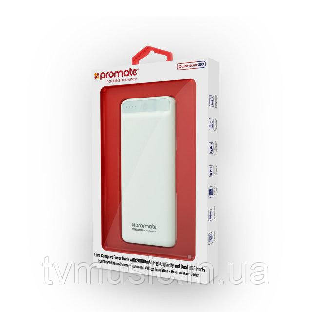 Повербанк Promate Quantum-20 поставляється у фірмовій упаковці. Доступні 4 кольори: білий, чорний, синій, червоний. Інтернет магазин TVMusic пропонує купити повербанк Promate Quantum-20 з доставкою по Україні і офіційною гарантією від виробника.